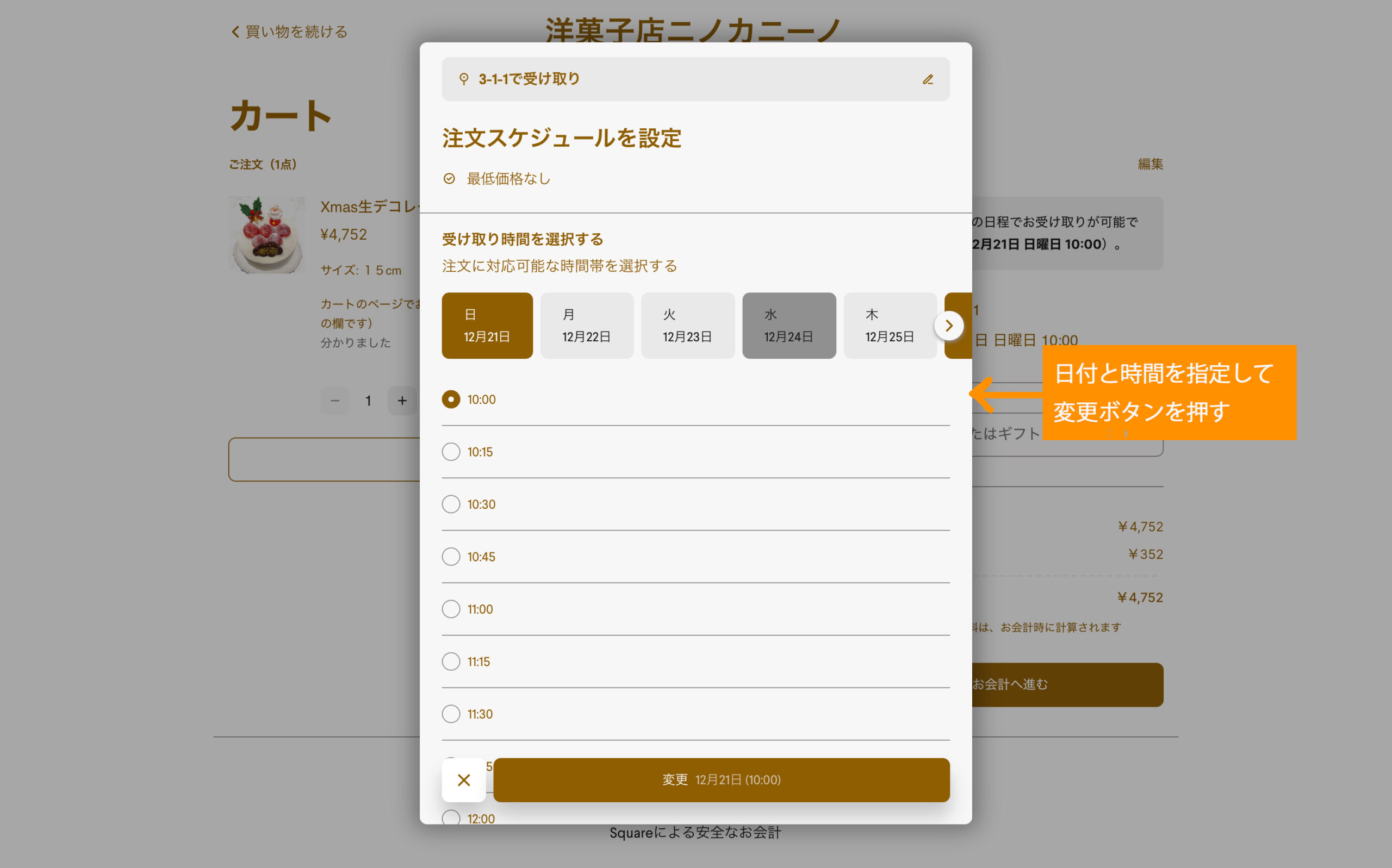 「注文のスケジュール設置」の画面で日付と時間を指定して、「変更する」をクリックしてください。