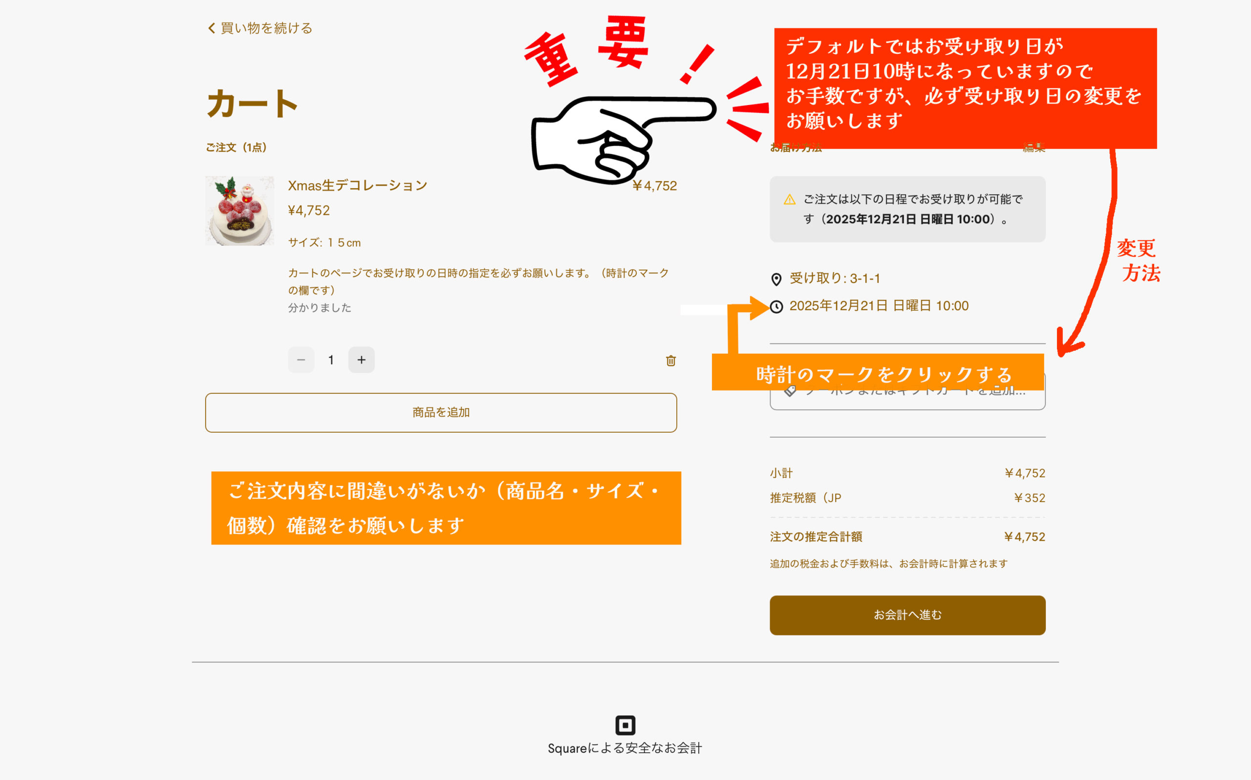 ※システム上 日付の指定は変更をしないと21日10時の受取りで指定されてしまうため